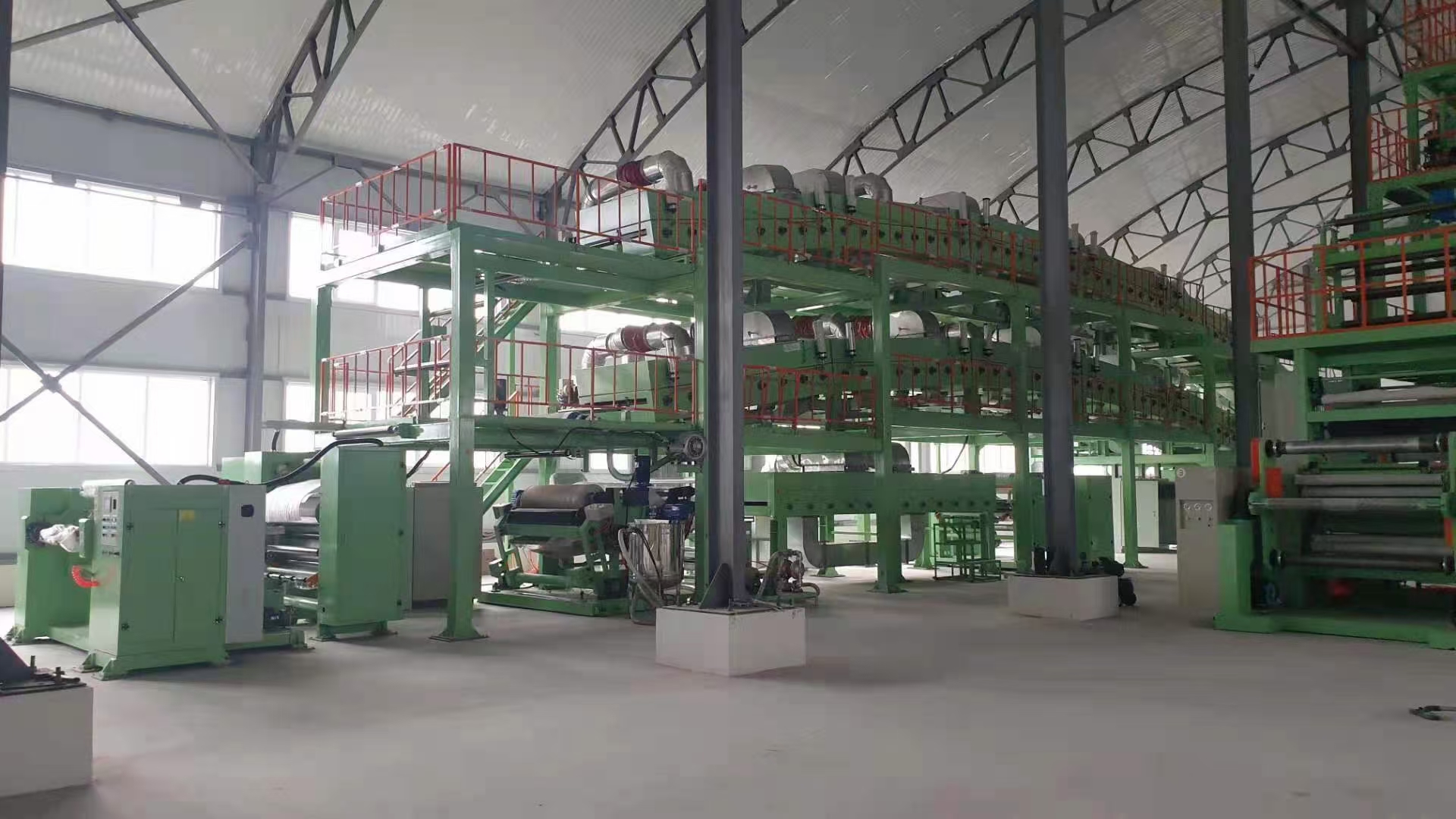 The granules manufactured by the granulating machine are transported to the machine. After heating and strong pushing of the screw, the temperature of the raw material is raised and together with the molten PE material to be extruded into a "T" type die to form a three-layer composite sheet material, stretched by a casting roller and adjust the thickness of the product by controlling the speed, and then cooled and shaped by the cooling wheel set, and then flatten, visually inspect, thickness test,and static elimination, then cut off the ear materials and wind up the finished paper.