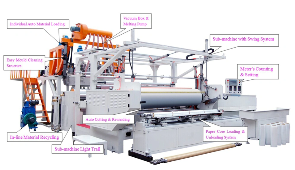 Now equipped with a more advanced CPP film production line, the ingredients no longer need to be stirred and mixed, but various raw materials are automatically sucked by the vacuum pump, and the screw is extruded and mixed, which saves labor costs; the feed is weighed and the number of rotations of the extruder is controlled. , Make the extrusion volume stable; set the processing temperature of each section reasonably according to the characteristics of different raw materials and extruders; the flow divider (FEEDBLOCK) is the key to the production of multi-layer CPP film; the casting roll is equipped with air knife or soft The wind box makes the film stick to the roll better. The die is equipped with a vacuum box to form a certain degree of vacuum when the film flows to the casting roll. The cooling effect of the film is good when the roll is applied, and the transparency is high; with the automatic adjustment of the die, the film can be effectively controlled The thickness uniformity of the CPP film; corona treatment makes the CPP film have printability, aluminum plating, and composite properties. Usually one-stop processing is enough for one side (there are also double-sided processing). For single-sided CPP film Particular attention should be paid to control not to cause back treatment; Neck-in is generated due to casting before winding, trimming is necessary, and the edge material should be recycled online, which can be directly mixed with new material for recycling or extrusion The machine is forced to feed the core layer for mixing and recycling; control the winding tension, usually use gap winding to make the CPP film roll with a certain amount of air, and shrink and set the shape during aging; then cut and inspect the packaged product.