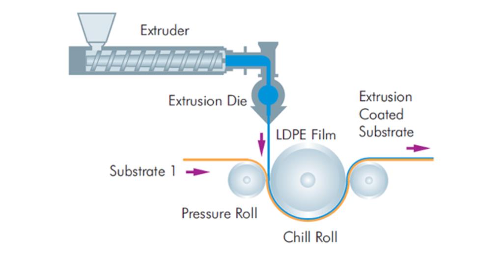 Extrusion lamination brings two films together using a layer of molten resin extruded through computer-controlled extruder dies with advanced gauge controls (nuclear gauge monitoring and automatic profile control). The two films and the molten resin form a multilayer flexible packaging lamination.